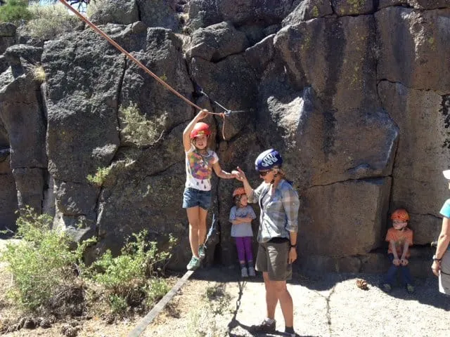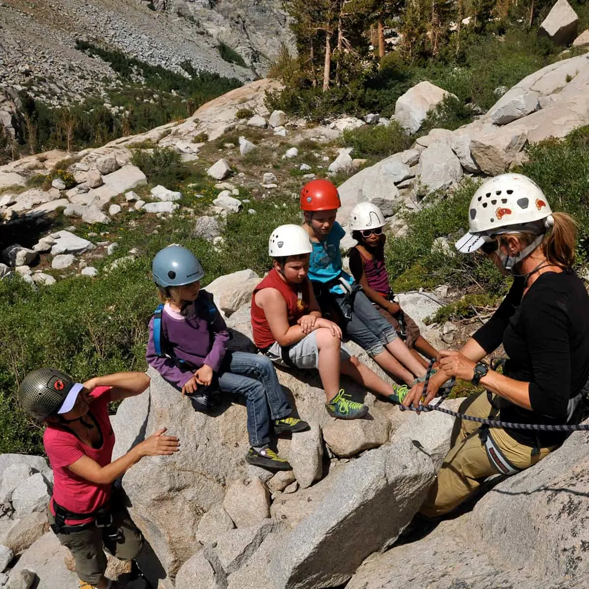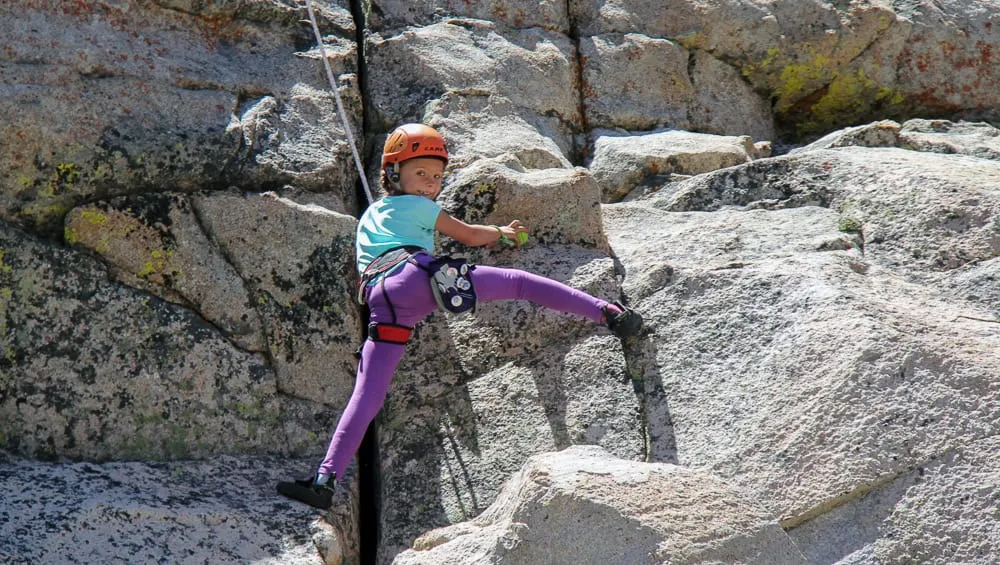 Since 2008, our popular and rewarding program has introduced children to the joys and wonders of rock climbing and bouldering in the Eastern Sierra in the summer. We create motivation to learn through use of “Milestones booklets” in which they check off climbing related skills as they learn and demonstrate new abilities. They are rewarded with buttons to show that they have reached next levels of achievement. Being in groups with their peers makes the learning and climbing more fun and engaging. We set up slack lines, rope swings, high lines, and more to get kids to trust climbing safety systems and maximize the fun factor of the week. We mix up the venues based on the weather conditions, but we climb in different areas to expose budding climbers to different rock types, mountain ambience, and climbing related diversions.